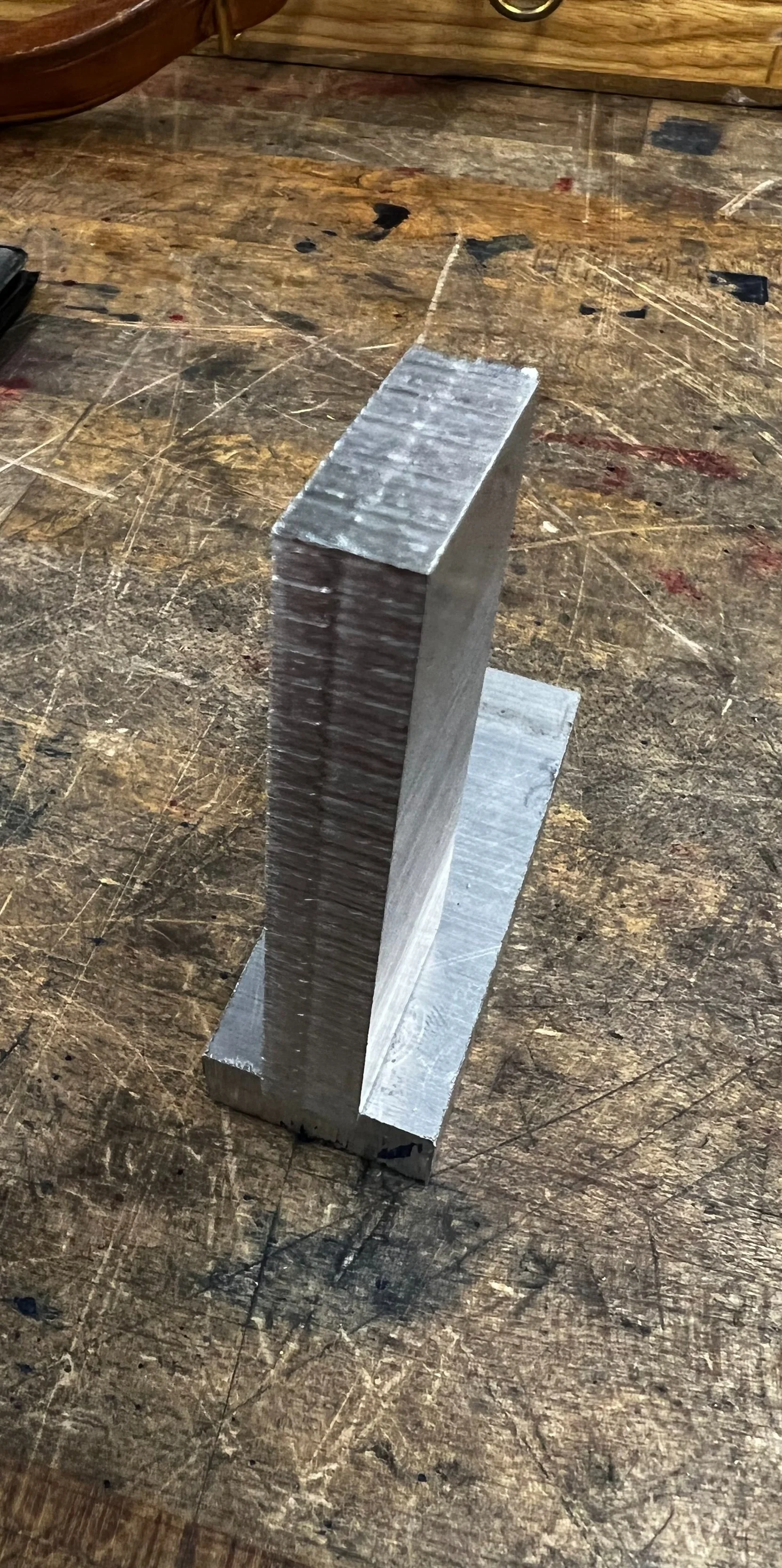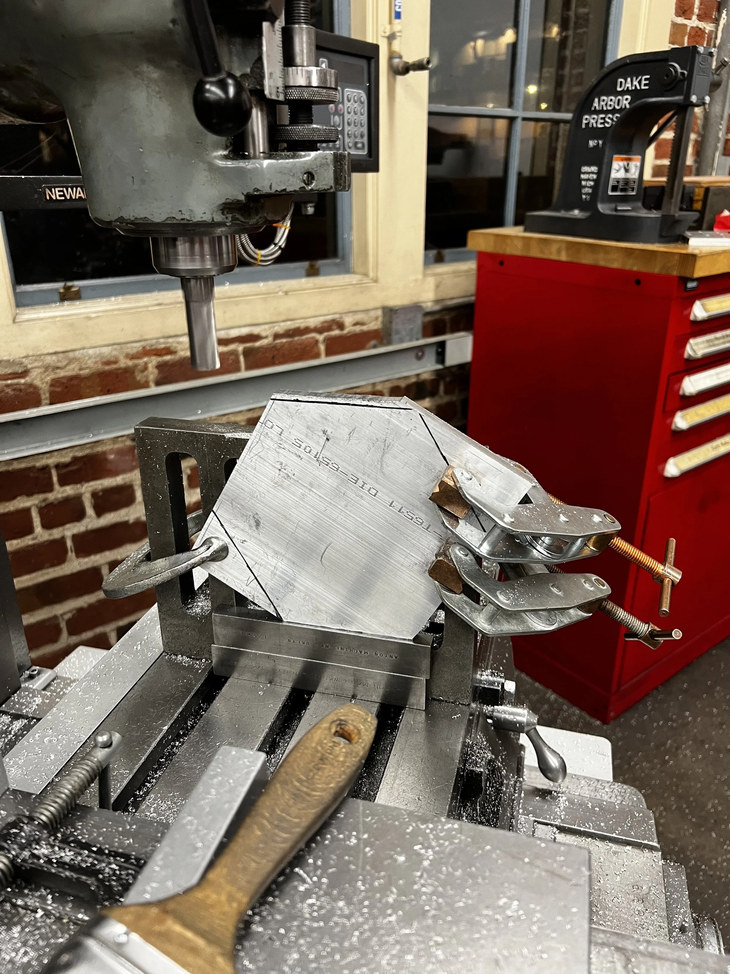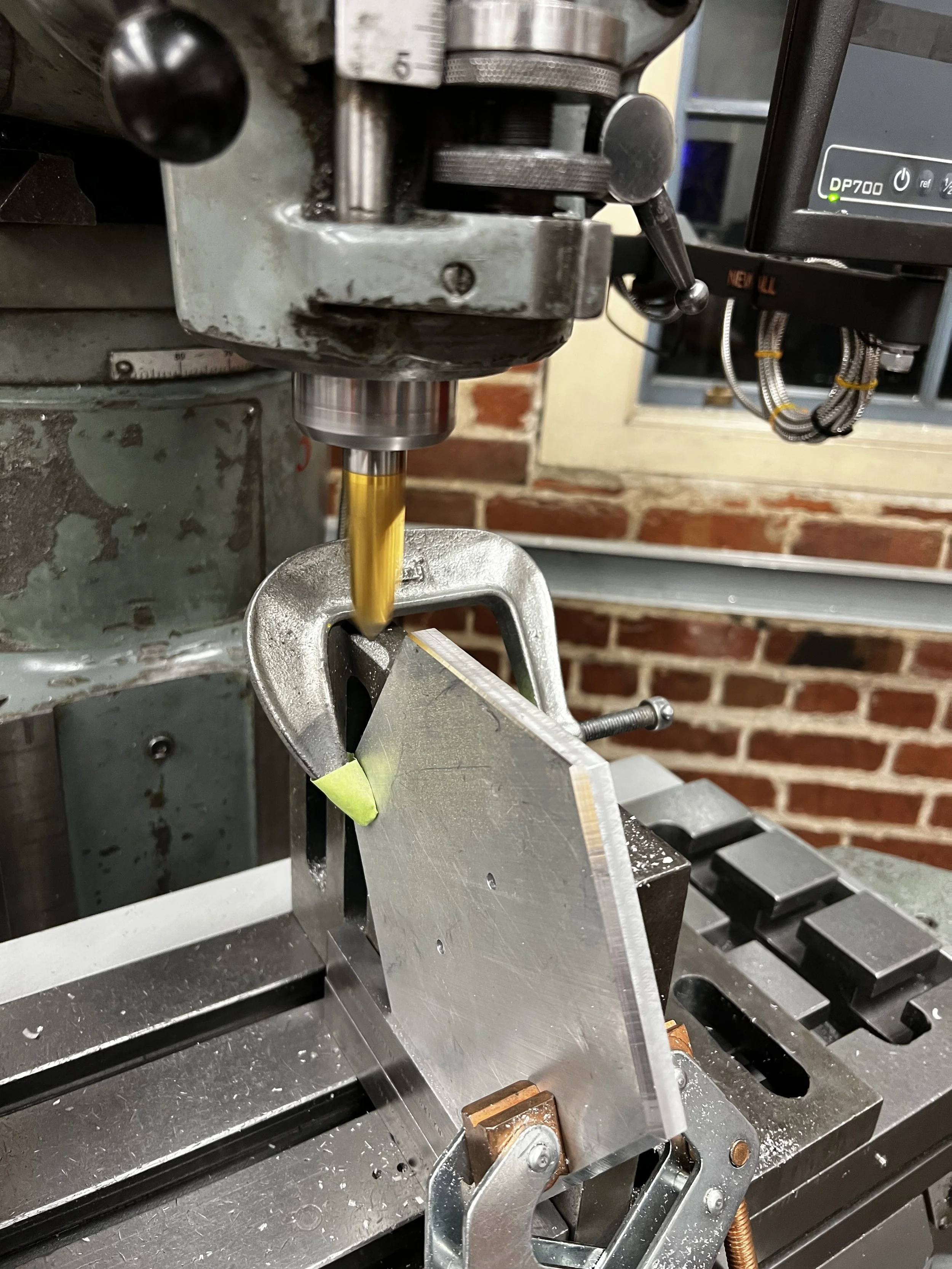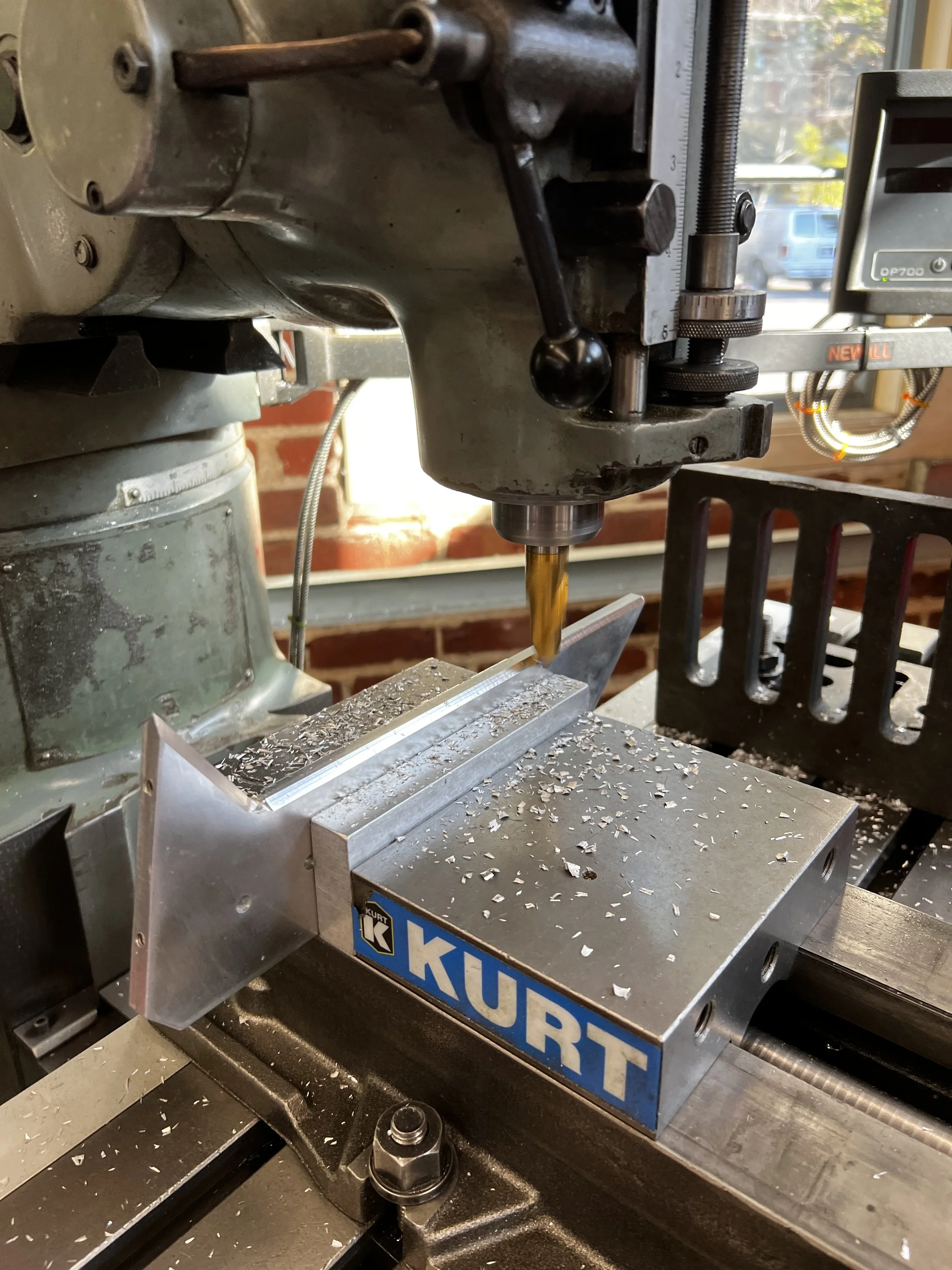 Using the mill to cut a plate of Aluminum 6061 into the spine, accurately distance arm holes, tapping screw holes