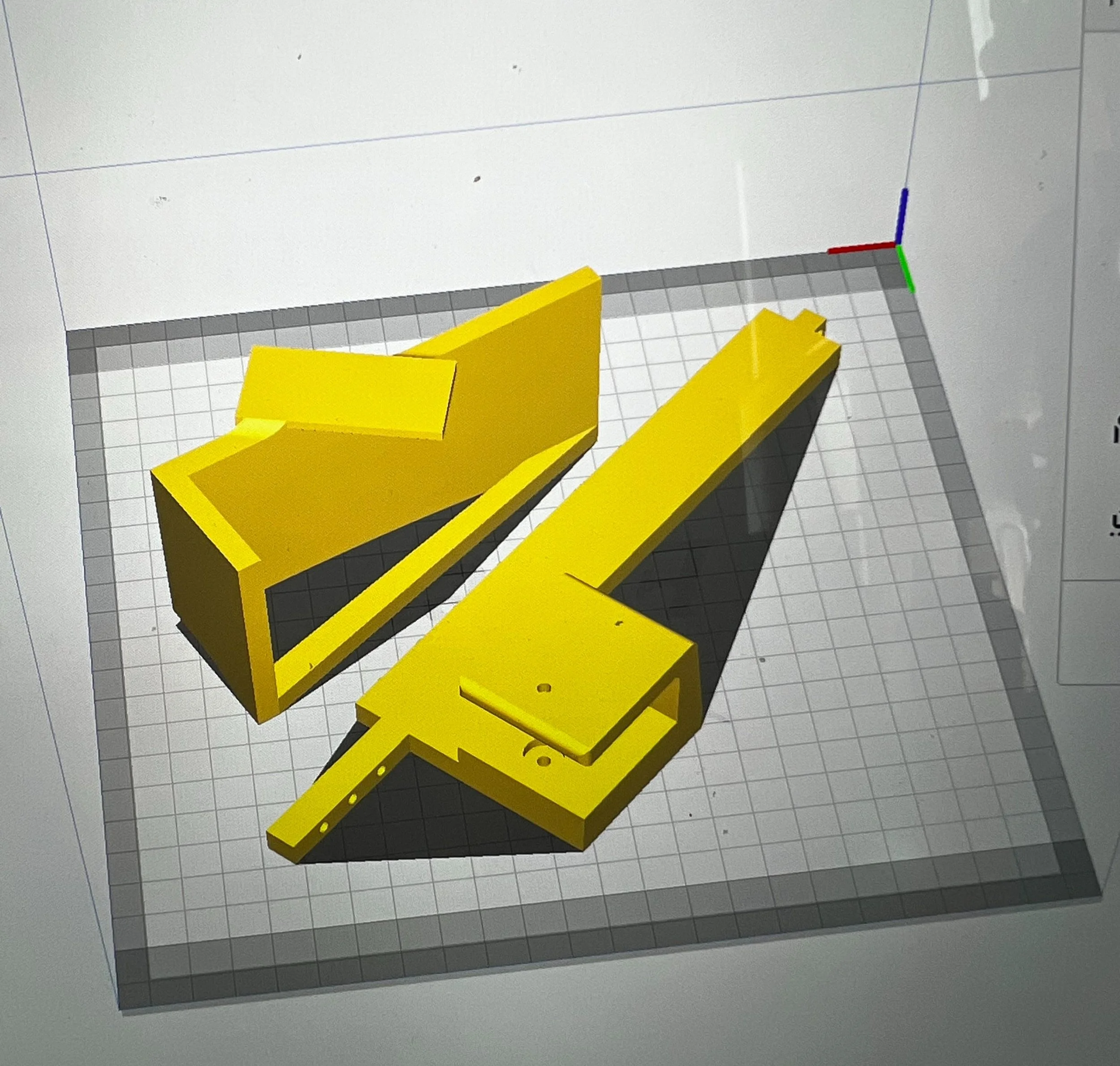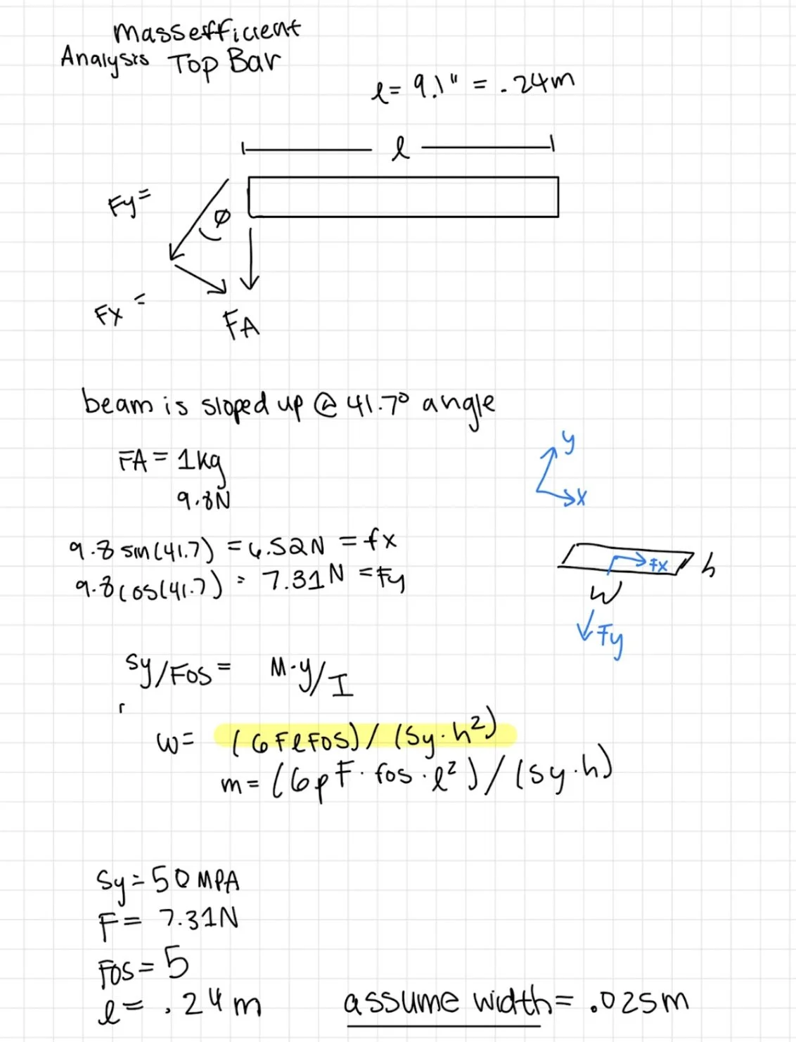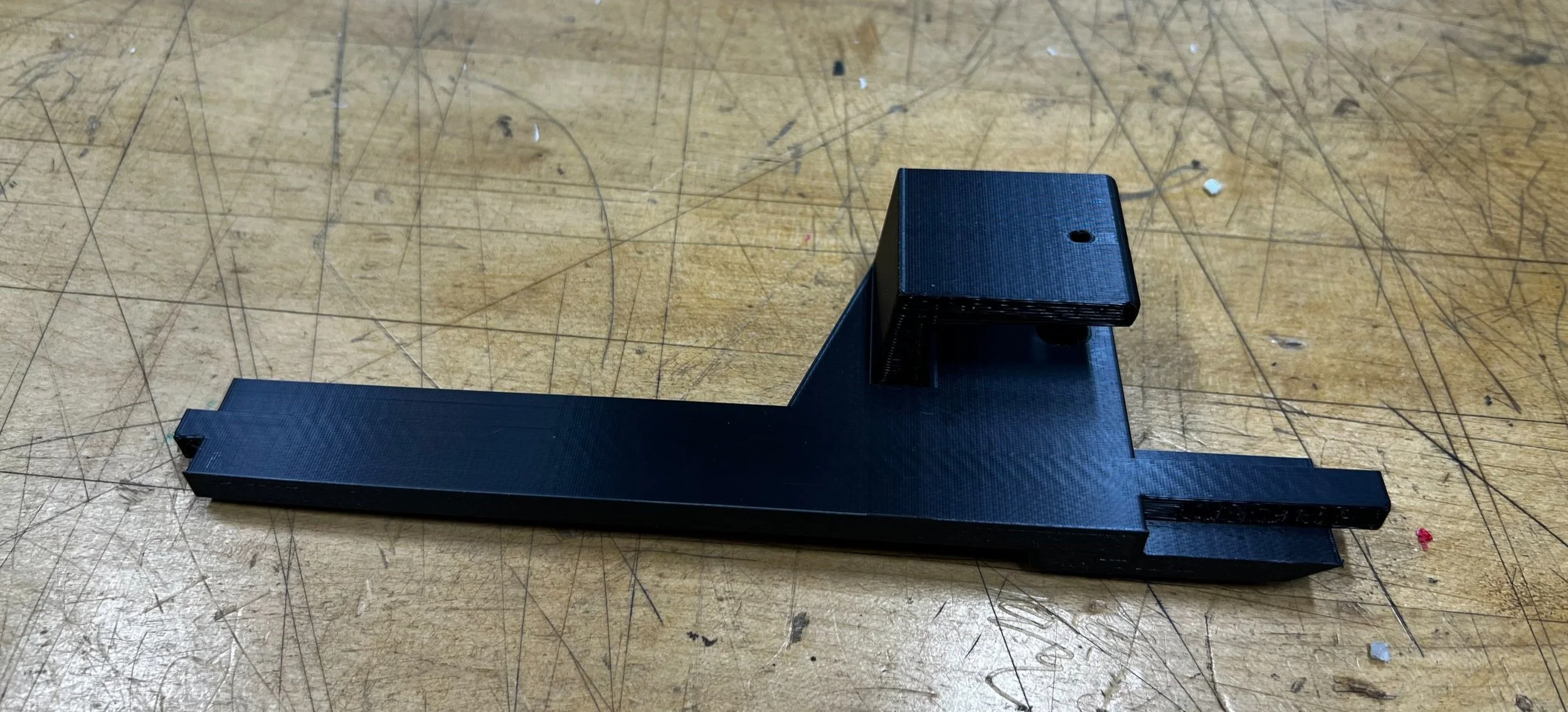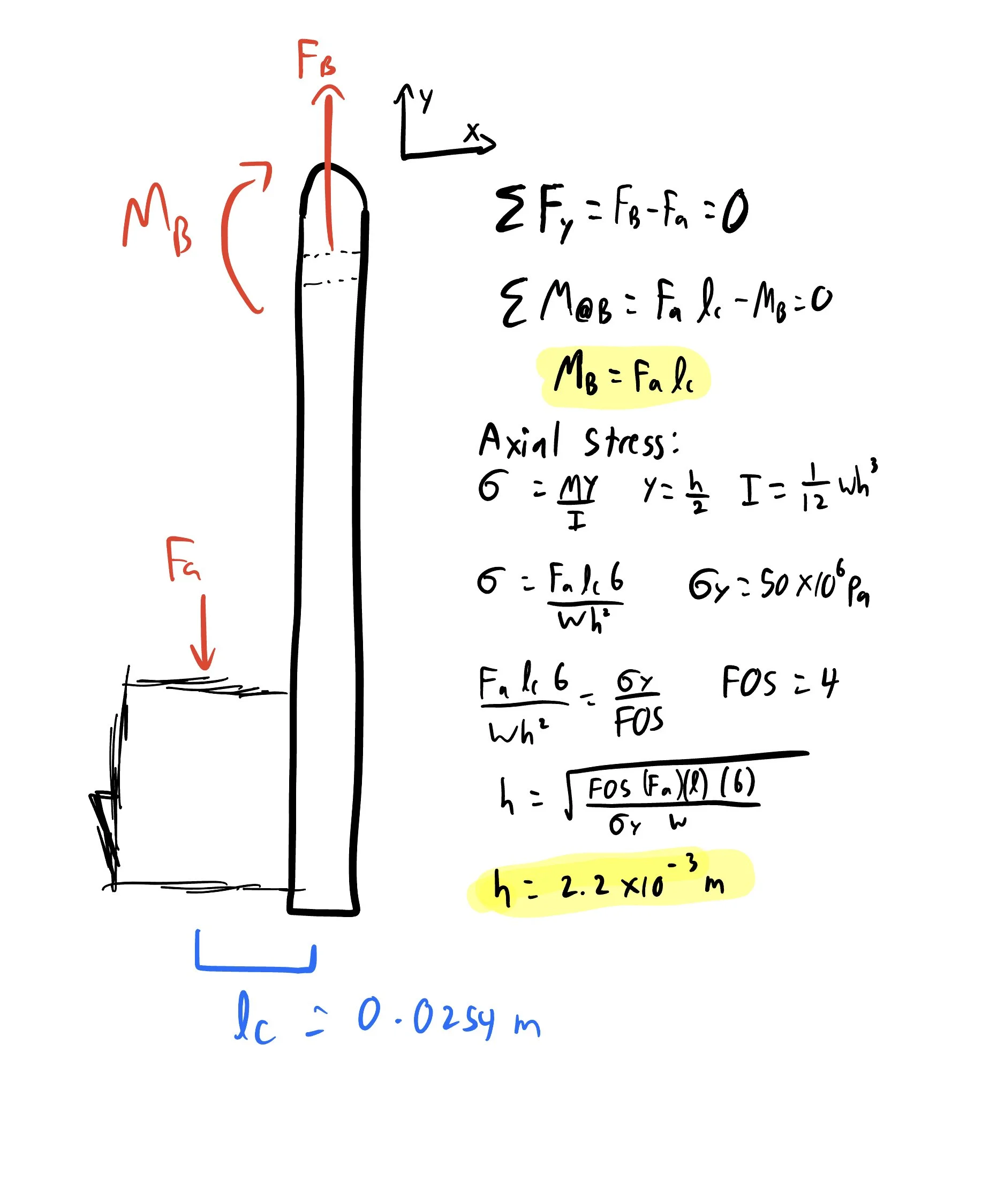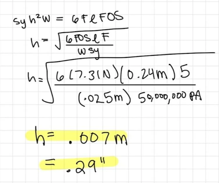 The sidebar was designed as two pieces, fixed together using adhesives: the vertical bar that implements a square slot to conjoin with the top bar, and the 41.7° angled cradle to hold the payload. The slot for the top bar accounts for a square peg and a pin connection, so that the sidebar could be positioned vertically, to reduce torsion on the connection point and to reduce swinging. This choice eliminated torsion and resulting stress and deflection, too much of which would result in interference between the top bar and the I-beam, reducing the normal force on the driving wheel. To comply with requirements for the position of the payload, a “cradle” attachment physically constrains the payload at the proper angle. Holding the cradle on the outside of the vertical bar decreases the max moment, and results in a shortened top bar. To follow the existing geometry of the top bar, the width of the sidebar is selected to be 0.025m and the thickness of the bar is then calculated to be 2.2 mm with a factor of safety of 4.