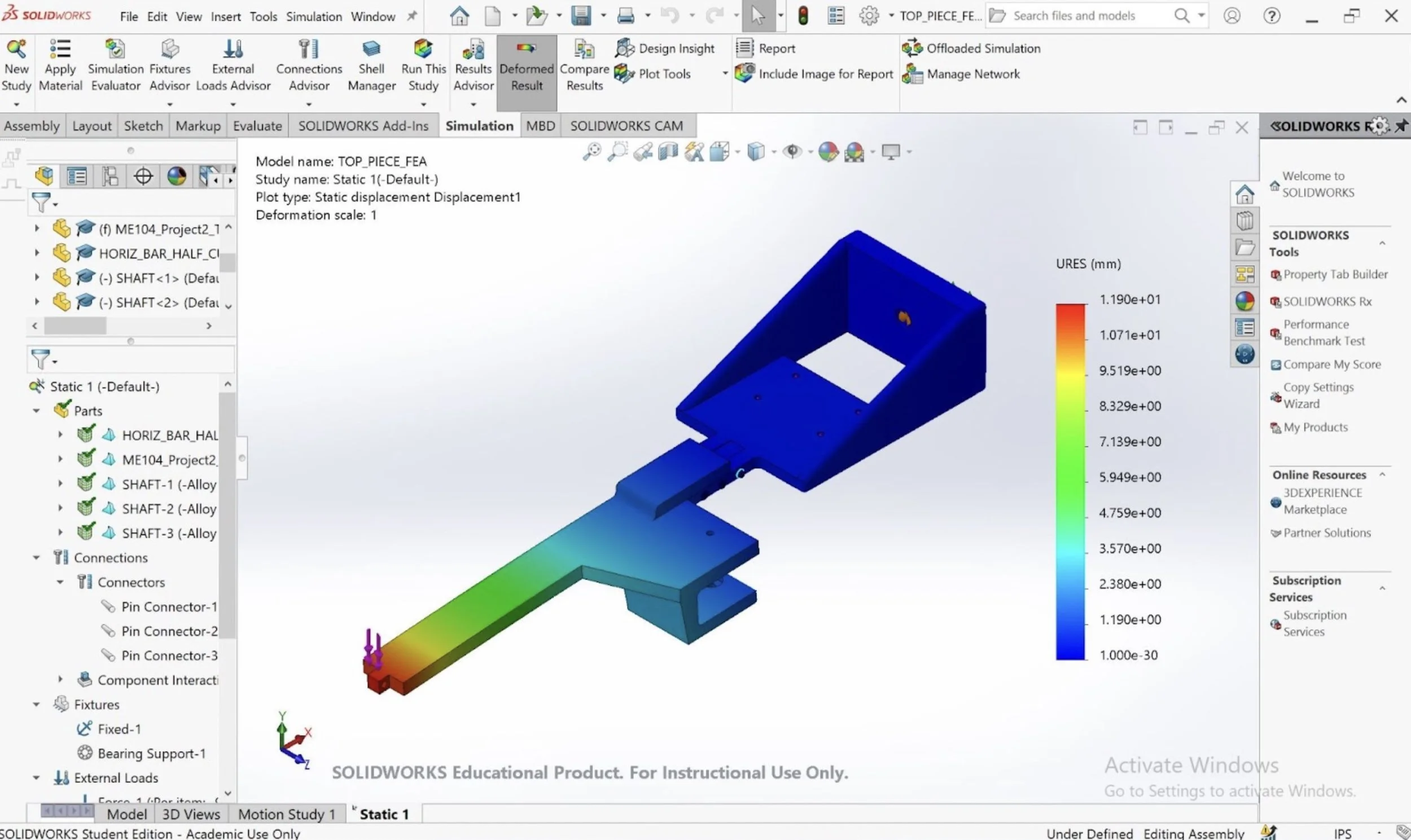 The displacement analysis of the top bar and the chassis demonstrates deflection at the end of the shaft close to the pin connection between the top and side bars. The thickness of 7mm is set to accommodate for the deflection of the top bar. With this design parameter, the top bar is expected to only deflect 1 cm at the greatest point of displacement.