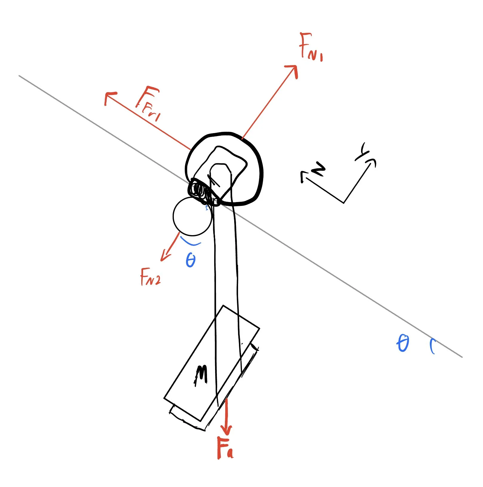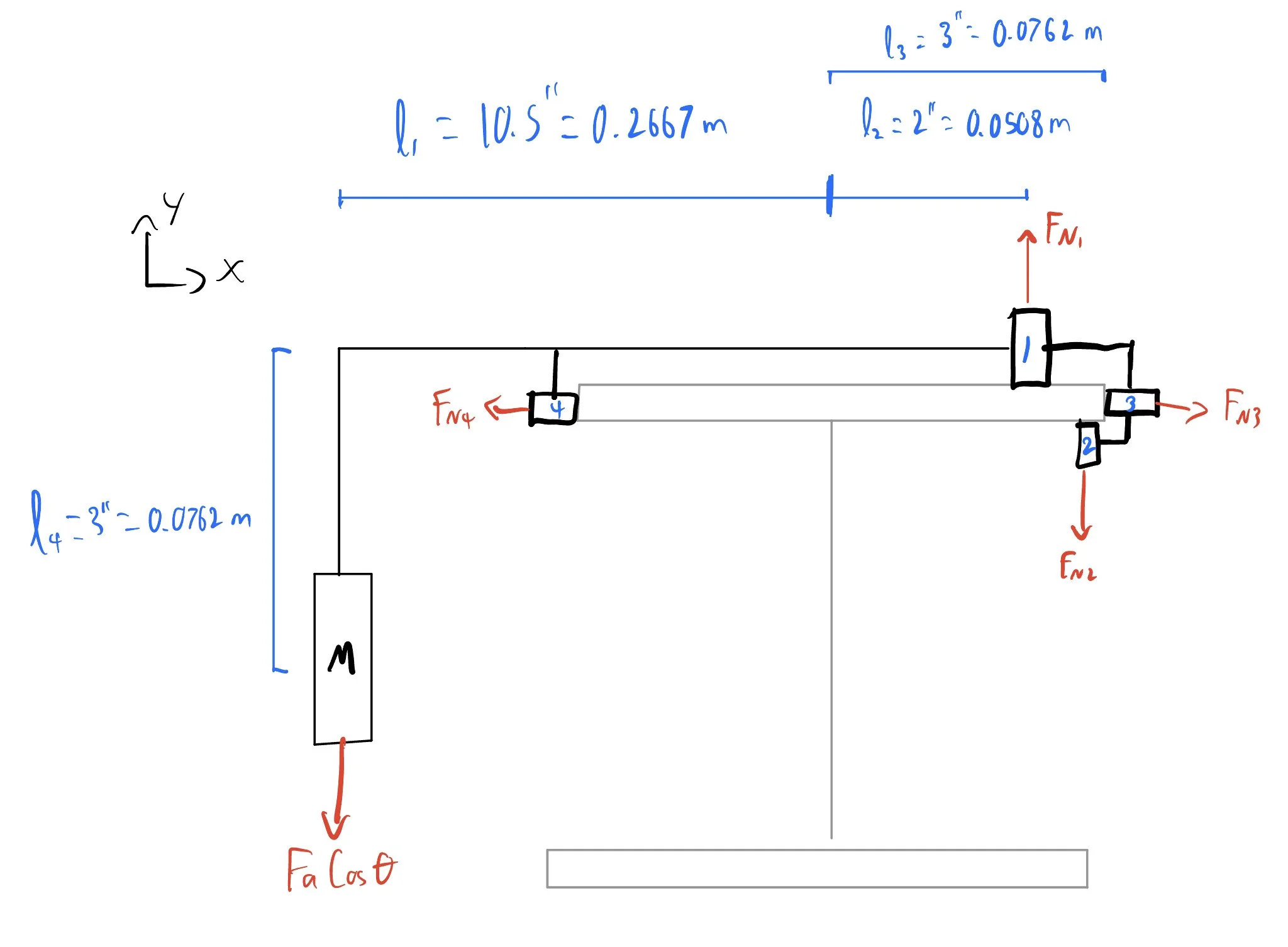 The normal force on the driving wheel was the most critical aspect of the design, as material constraints required us to sustain the coefficient of friction of 0.1. This variable was determined using FBDs, and maximized by increasing the length of the lever arm from the payload to the driving wheel. Solving the FBDs gave us a minimum value of 65.3N, and we exceeded this by designing for value of 98.88 N. Four wheels were used to counteract the moment on the driving wheel created by the payload in two planes and achieve static equilibrium. This was achieved by including the driving wheel on top of the I-Beam, the bottom wheel under the lip, and two side wheels offset from the horizontal axis of the robot to act as constraints.