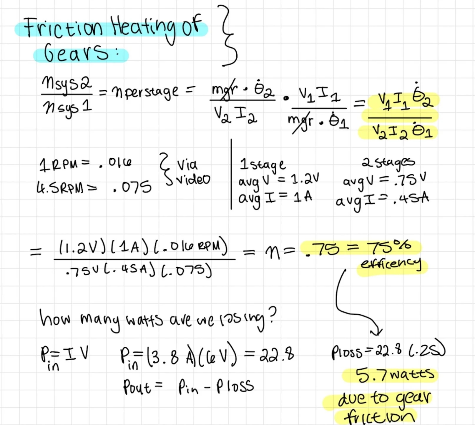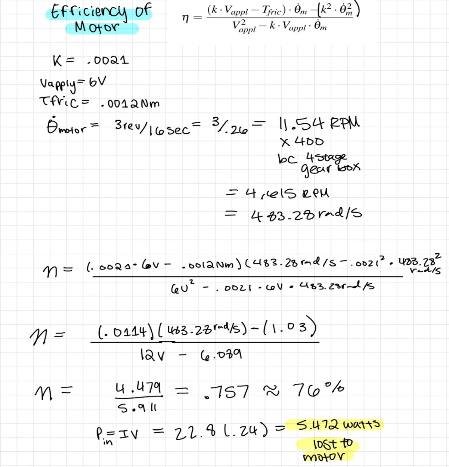 Efficiency of the motor was calculated using constants that were calculated through taking experimental measurements using the motor at 0 and max stall. This resulted in a calculated motor efficiency of 76 percent. Additionally, power loss was calculated considering friction heating of the gears, as well as bearing and wheel deformation, however these were calculated to be 0.005 Watts, and were determined to be negligible. A loss of 5.7 Watts was calculated to be due to gear friction.