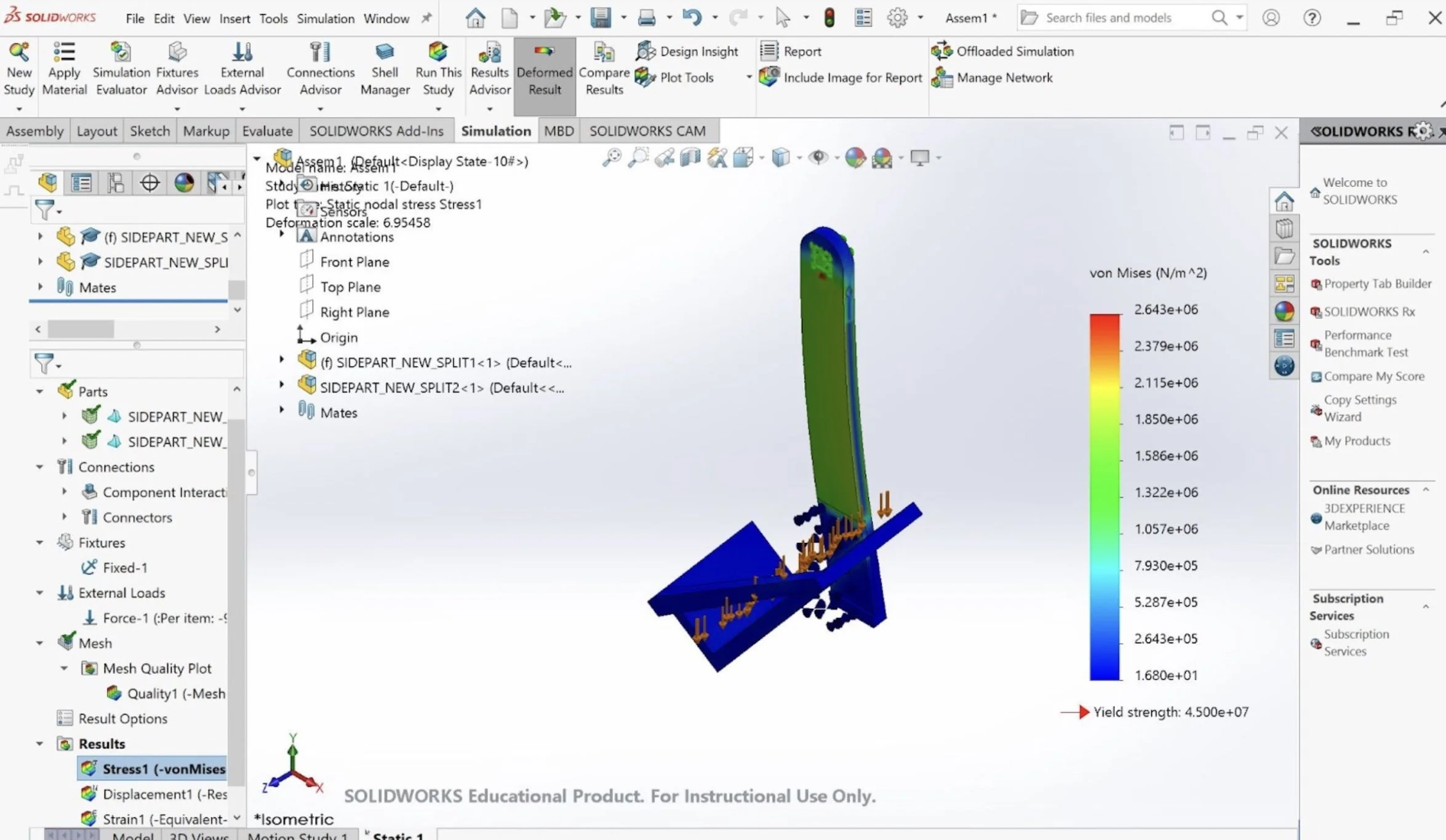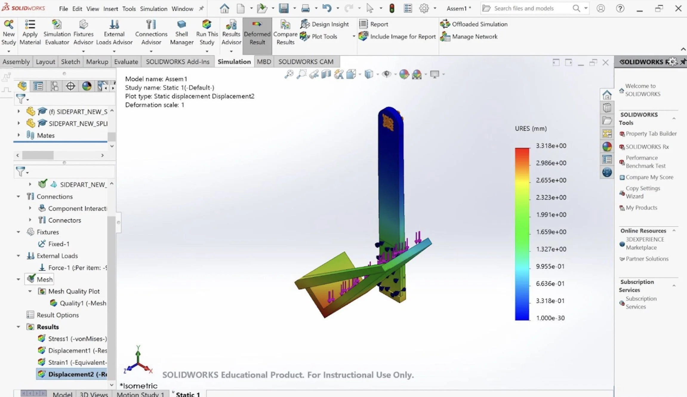 Allowing the bar to remain vertical to the ground, reduces the deflection and stress, resulting in a more efficient part. The FEA supports this idea by showing the minimal stress experienced by the sidebar. However, the sharp angle in the cradle is experiencing a higher stress, so a crossbar was added and the thickness of the cradle was increased such that the stress does not exceed beyond 12.5 MPa.