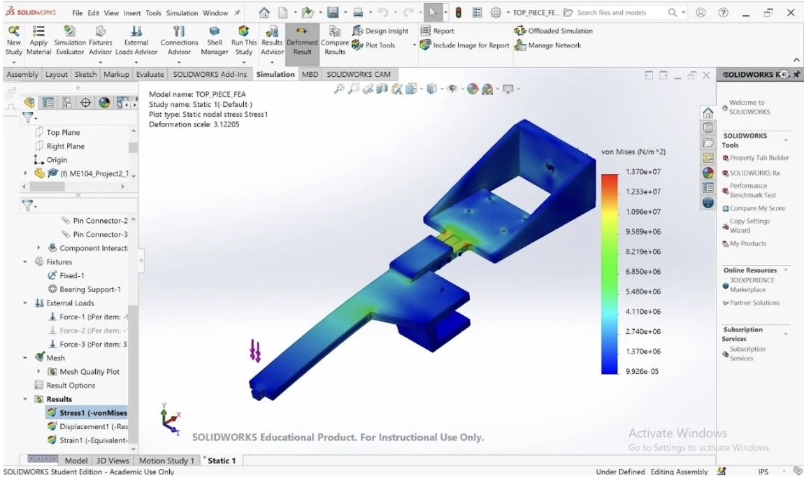 This project helped me gain proficiency in FEA simulations to know how to set up models, define materials, and interpret results. Knowing how to apply boundary conditions, loads, and constraints helped us confirm design choices and optimize parts.