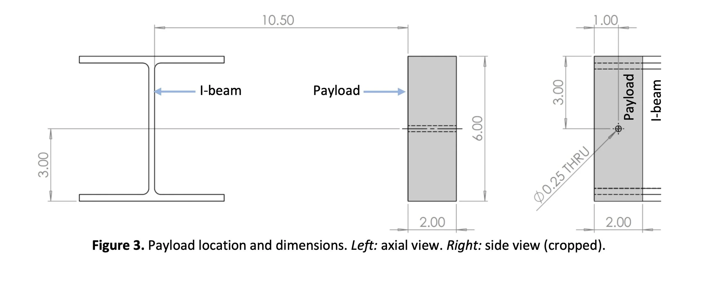 The 1 kg payload will be made of aluminum, with dimensions as depicted in Figure 3. It must be carried with position and orientation relative to the I-beam as depicted.